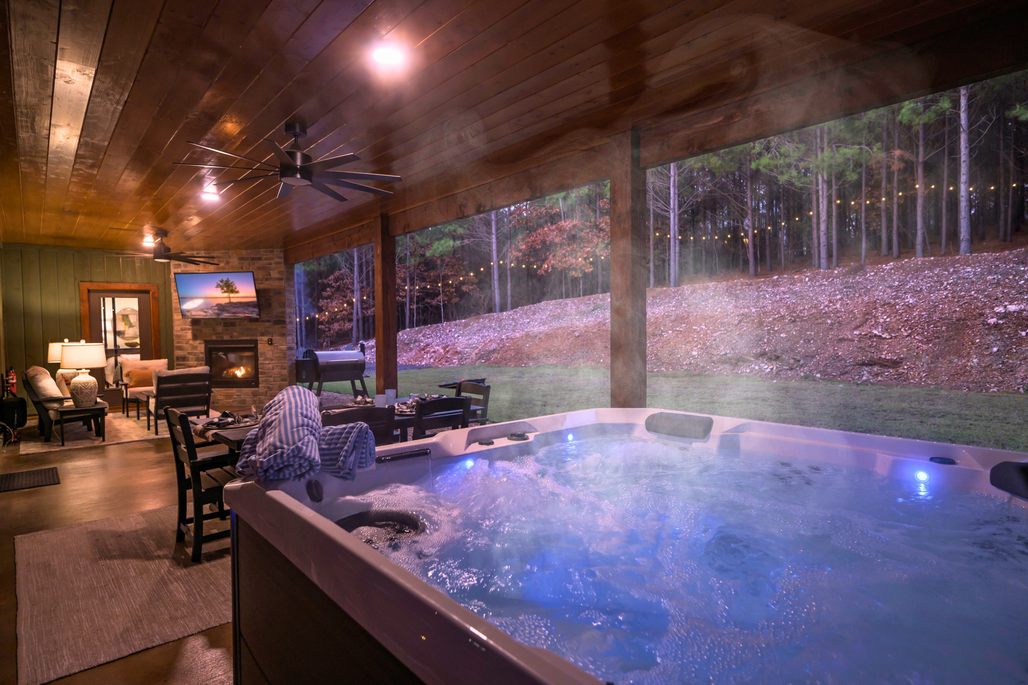 • 6-person hot tub with forest views